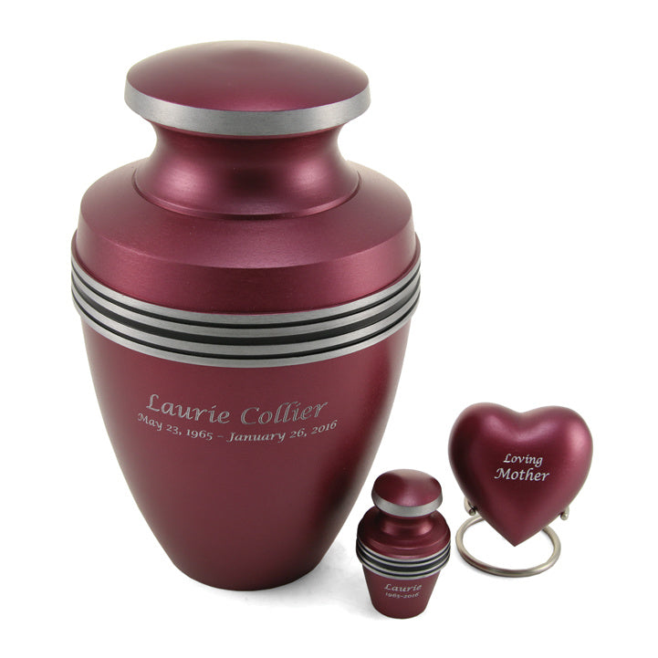 The Full Size Grecian Urn measures 10.6”H x 6.6” Diameter (200 cubic inches), the Keepsake Mini is 2.9”H x 1.8” Diameter (3 cubic inches), and the Keepsake Heart is 2.7”H x 2.9”W x 1.6”Diameter (3 cubic inches).