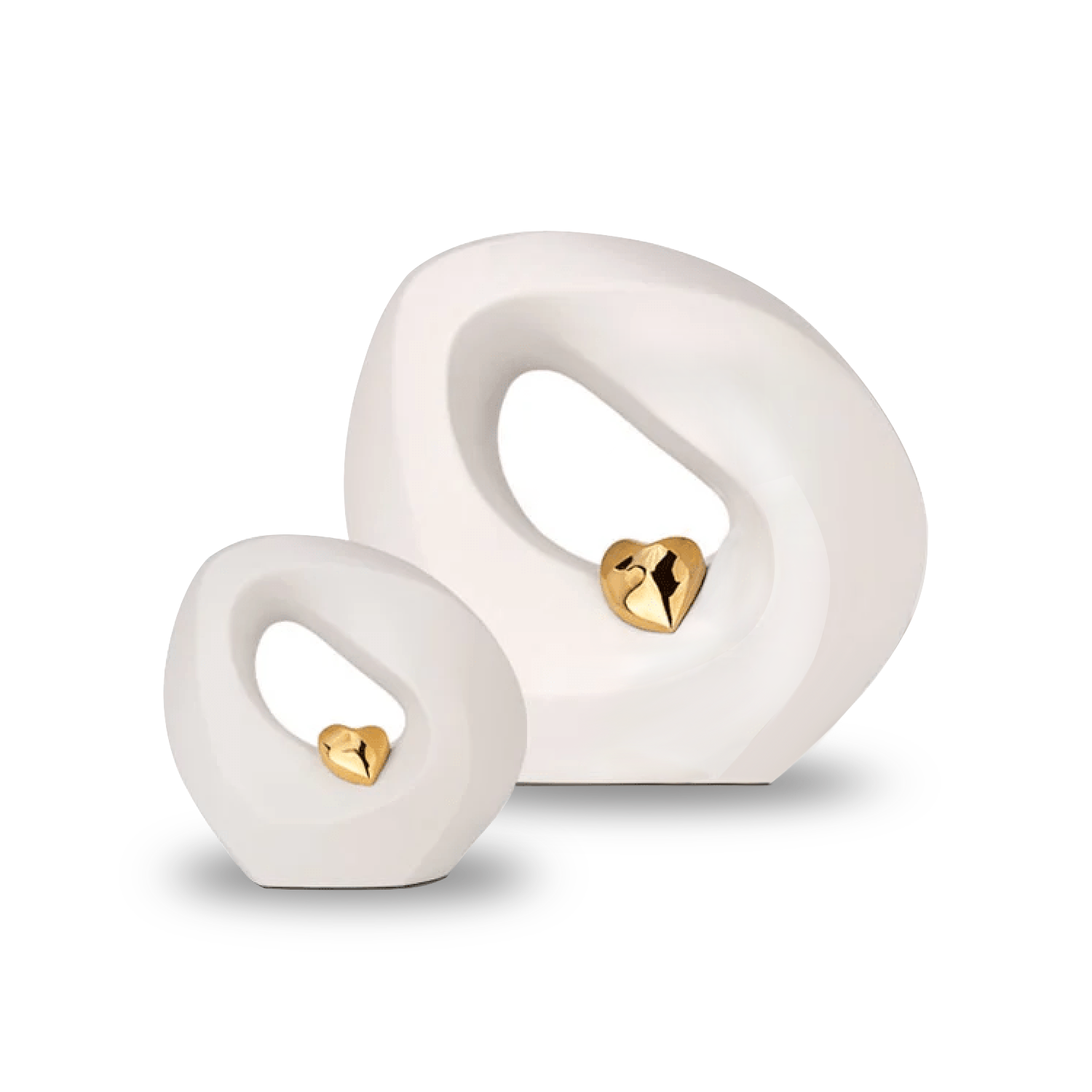This stunning modern memorial urn is handcrafted from porcelain and provides a unique and beautiful look. It comes in two colors (white and black) and two sizes (full size and keepsake). Place this beautiful piece of art on a living room table, the mantle, or in the bedroom to keep your loved one close.