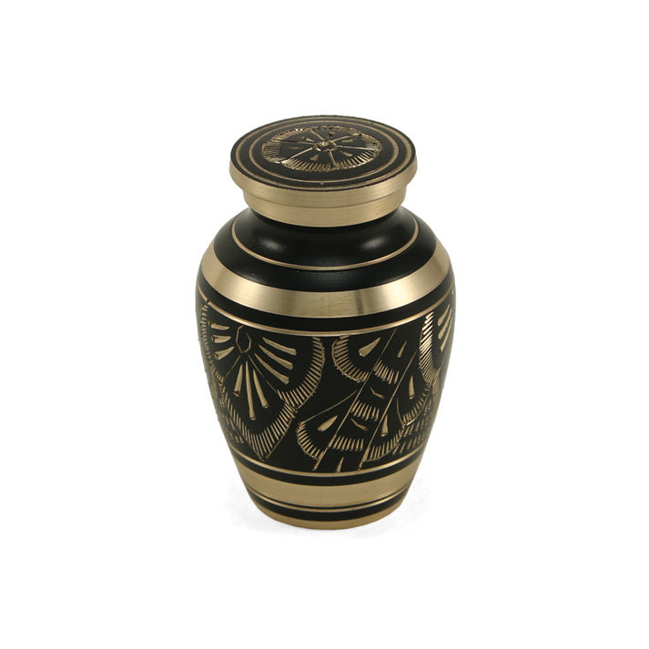 Let your loved one’s memory be a shining light with this brass cremation urn from our Elite Radiance Collection. Featuring a bold black finish, this full size piece is engraved by hand to showcase beautiful brass highlights in an ornate design.